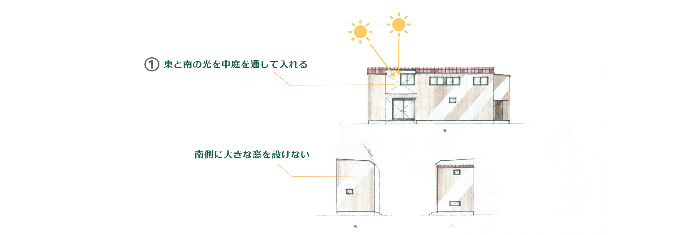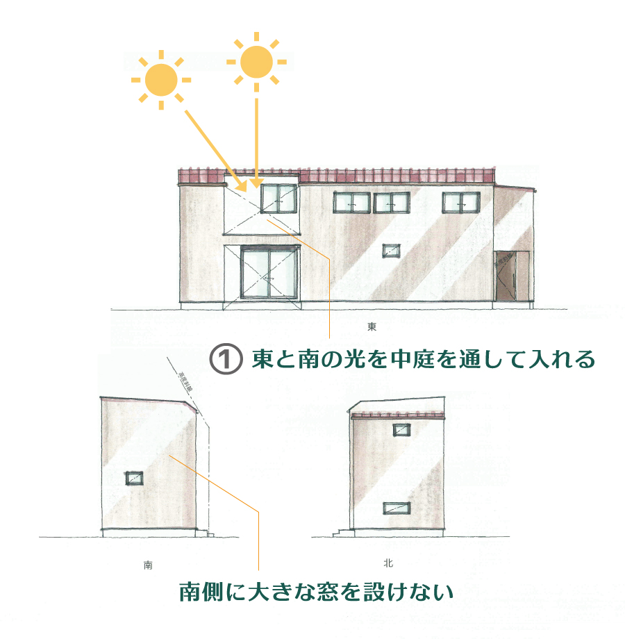 この状況に対する建築士の回答は、「南面を閉じて中庭をつくる。」