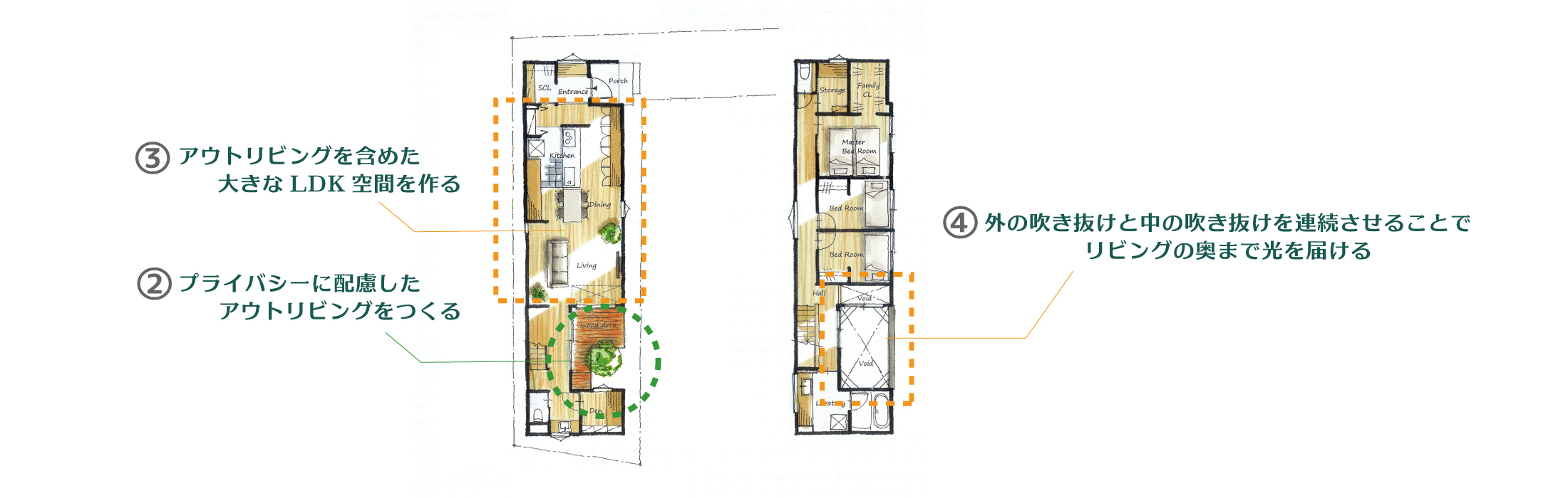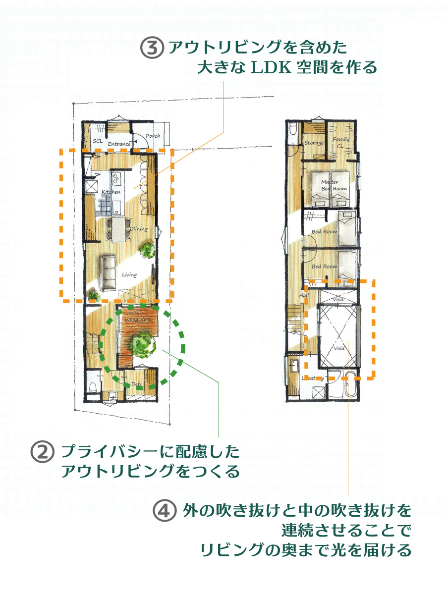 - ②プライバシーに配慮したアウトリビングを確保できる。